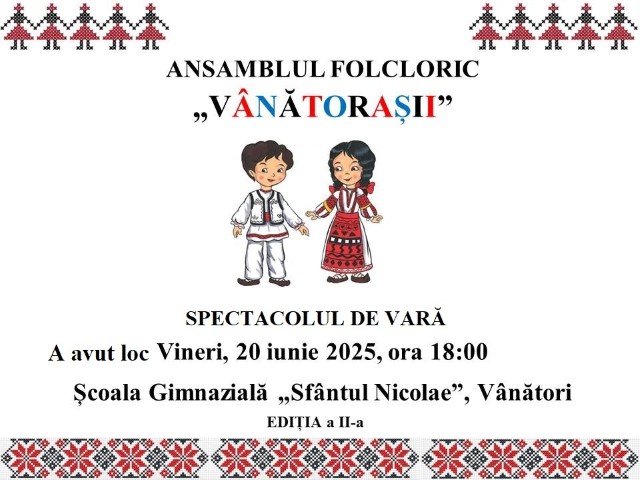 Ediția a II-a a spectacolui de vară a „Vânătorașilor”, a fost prilej de bucurie și mândrie pentru noi toți. Felicitări elevilor noștri ambițioși care doresc să păstreze vii tradițiile noastre naționale folclorice! Mulțumiri alese părinților, doamnei director și cadrelor didactice coordonatoare Dimofte Gherghina Gina, Pîrlog Nicoleta!